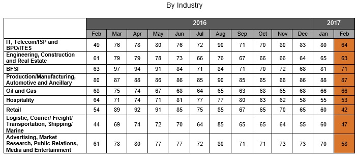 The Retail sector fared the lowest amongst all industries in online hiring, reporting -22% year-on-year in February 2017.