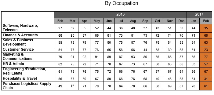 Customer Service professionals continued to fare the worst in online hiring, exhibiting a sharp -55% annual decline – plunging further from the -52% annual decline recorded in January 2017.